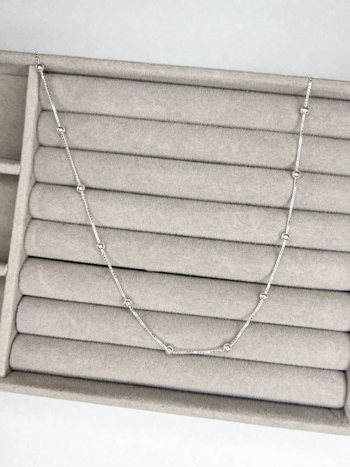 Seu design traz pequenas esferas distribuídas ao longo da corrente, criando um visual moderno e leve, perfeita para usar sozinha ou compor com outros colares.